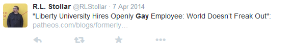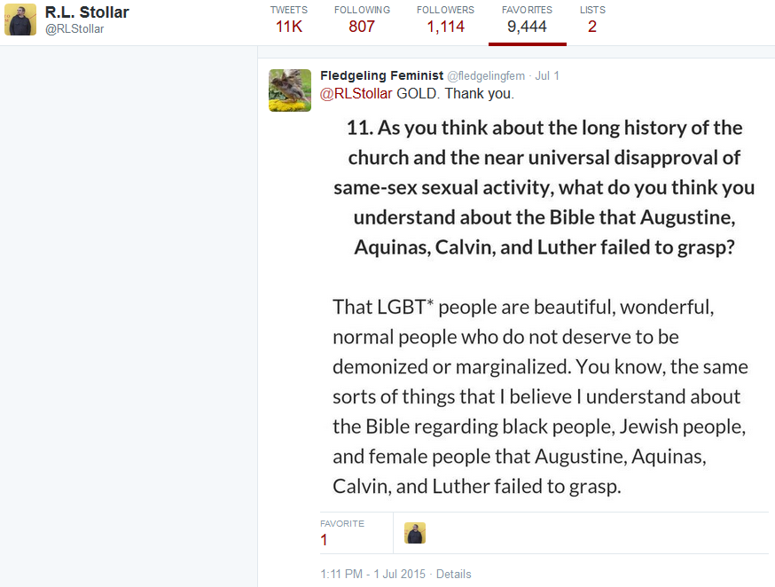 R.L. Stollar “favorites” pro-LGBT/anti-GOSPEL tweets! As Jeff Isaiah lovingly engaged Mr. Cruz with Gospel truth, R.L. Stollar stood with Mr. Cruz against the Gospel, actively helping to damn the man’s soul. R.L. Stollar simultaneously acted as the enemy of the Gospel of Jesus Christ and of Mr. Cruz’s soul: