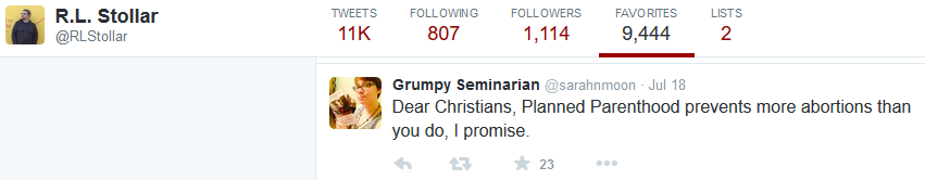 R.L. Stollar “favorites” a woman claiming PLANNED PARENTHOOD has prevented more abortions than Christians, and boasting that she donated money to the most prolific baby murdering institution on the planet.